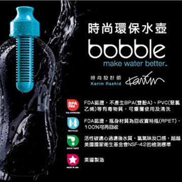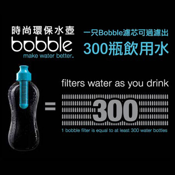 bobble是個帶有活性碳的水質過濾水壺,立即去除一般都市自來水的氯與有機汙染物,只要水龍頭一開,透過bobble的專利過濾器,馬上有乾淨清甜的純水可以喝!不需要到處找飲水機,不需要在家忙著煮滾水,不需要買瓶裝水對環境造成負擔,不需要羨慕日本水龍頭一開水就可以喝這檔事,擁有一個 bobble,等於擁有一台隨身的超強淨水系統,走到哪乾淨的飲水跟到哪!